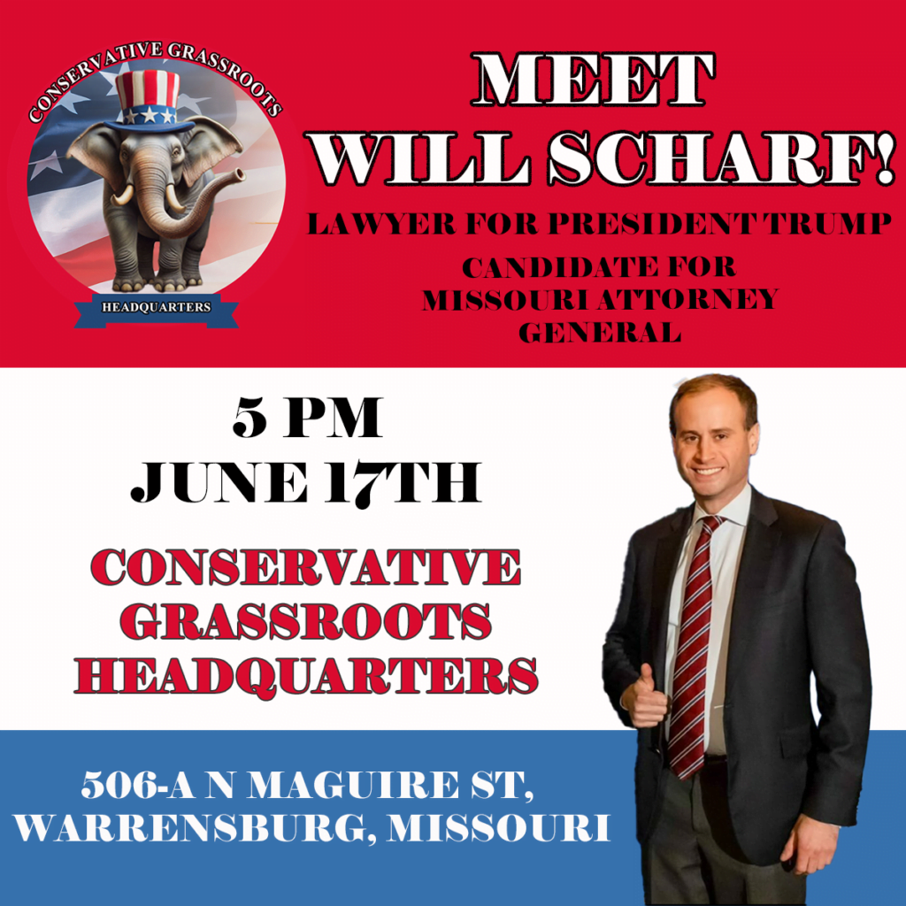 Meet Trump Lawyer and candidate for Missouri Attorney General Will Scharf will be at the Conservative Grassroots Headquarters at 5pm on June 17th, 2024.